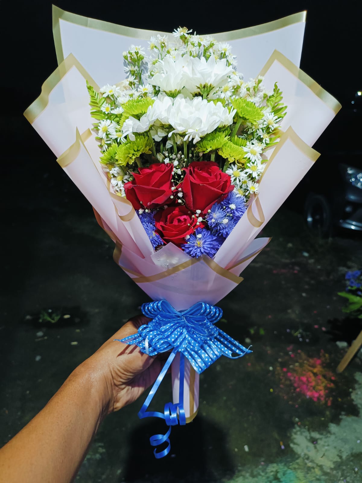 - Bunga papan dengan 5 titik bunga kombinasi pita hati : Rp 1.100.000